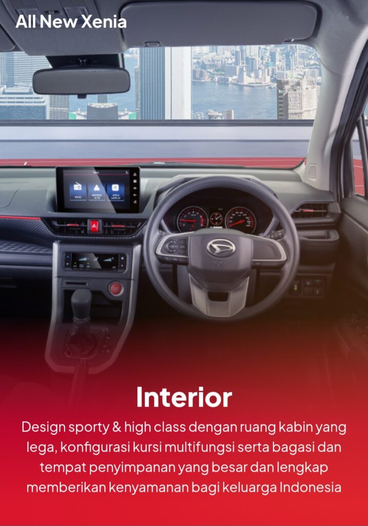 Desain sporty dan high-class dengan kabin yang luas, konfigurasi kursi yang fleksibel, dan ruang bagasi dan penyimpanan yang luas dan lengkap memberikan kenyamanan untuk keluarga IndonesiaSemua Tipe.